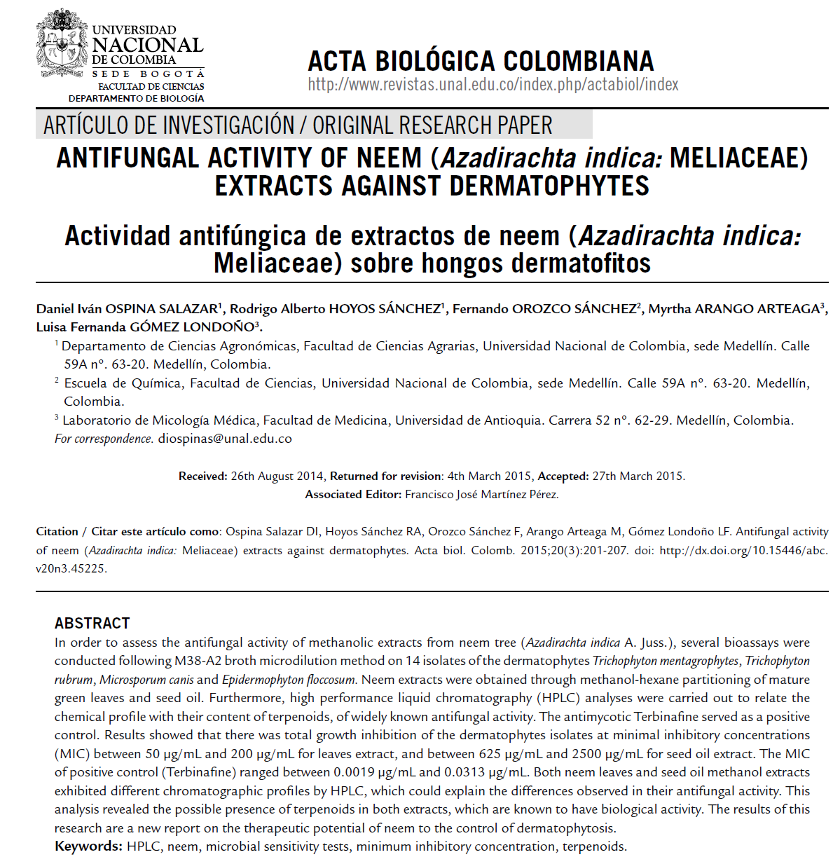 chemical profile with their content of terpenoids, of widely known antifungal activity. The antimycotic Terbinafine served as a positive control. Results showed that there was total growth inhibition of the dermatophytes isolates at minimal inhibitory concentrations (MIC) between 50 μg/mL and 200 μg/mL for leaves extract, and between 625 μg/mL and 2500 μg/mL for seed oil extract. The MIC of positive control (Terbinafine) ranged between 0.0019 μg/mL and 0.0313 μg/mL. Both neem leaves and seed oil methanol extracts exhibited different chromatographic profiles by HPLC, which could explain the differences observed in their antifungal activity. This analysis revealed the possible presence of terpenoids in both extracts, which are known to have biological activity. The results of this research are a new report on the therapeutic potential of neem to the control of dermatophytosis.