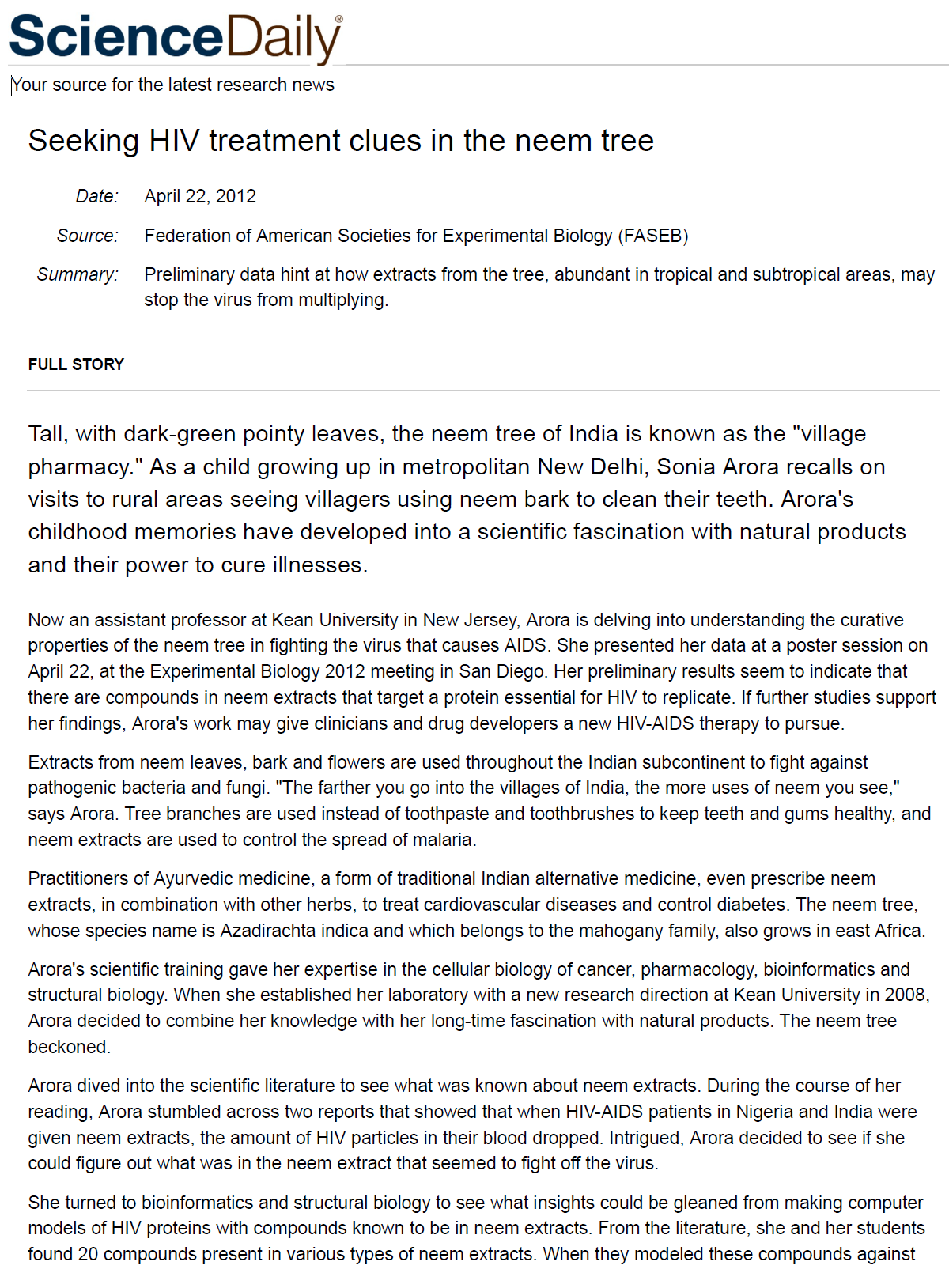 Now an assistant professor at Kean University in New Jersey, Arora is delving into understanding the curative properties of the neem tree in fighting the virus that causes AIDS. She presented her data at a poster session on April 22, at the Experimental Biology 2012 meeting in San Diego. Her preliminary results seem to indicate that there are compounds in neem extracts that target a protein essential for HIV to replicate. If further studies support her findings, Arora's work may give clinicians and drug developers a new HIV-AIDS therapy to pursue.