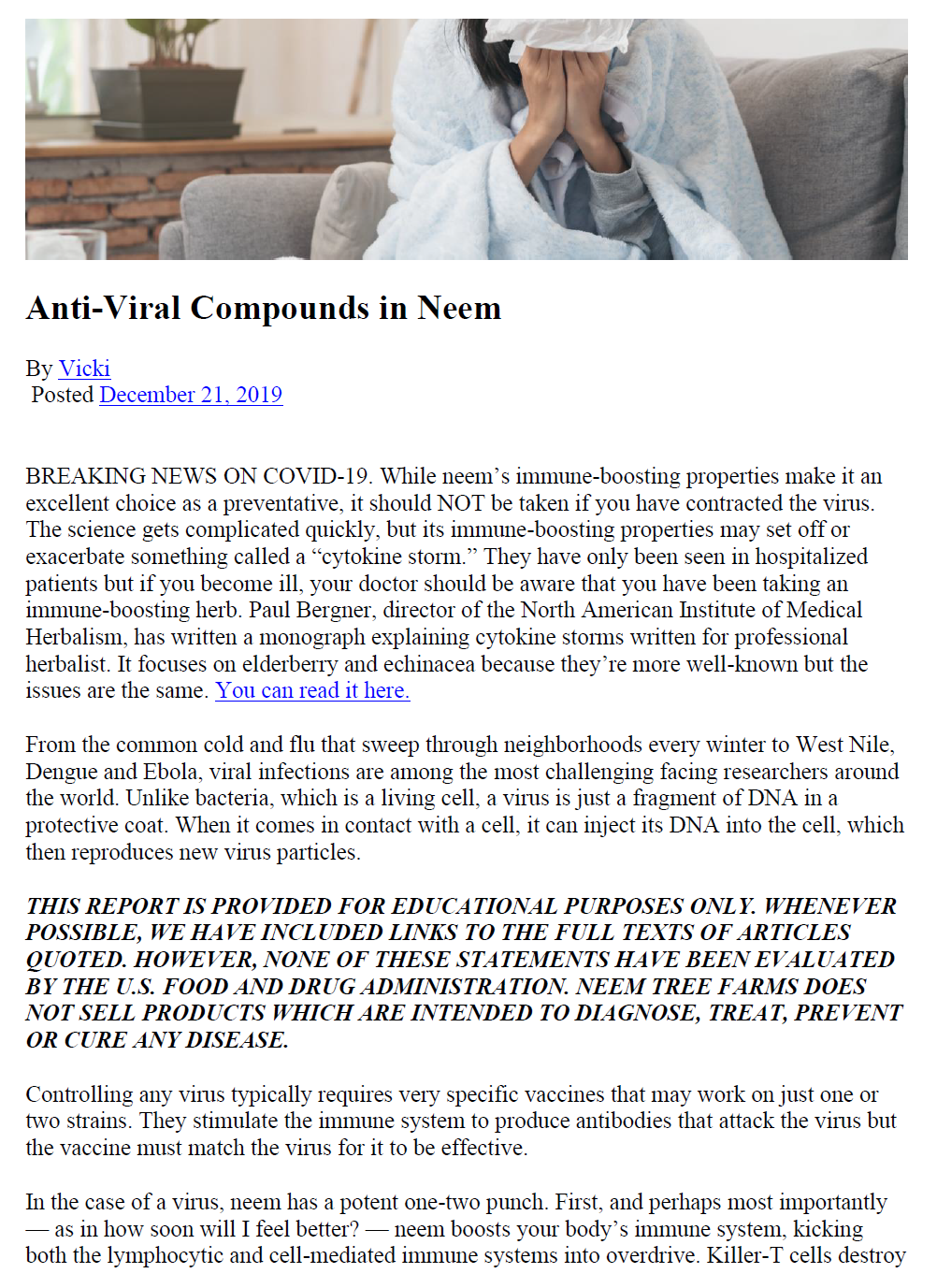 While neem’s immune-boosting properties make it an excellent choice as a preventative, it should NOT be taken if you have contracted the virus. The science gets complicated quickly, but its immune-boosting properties may set off or exacerbate something called a “cytokine storm.” They have only been seen in hospitalized patients but if you become ill, your doctor should be aware that you have been taking an immune-boosting herb.