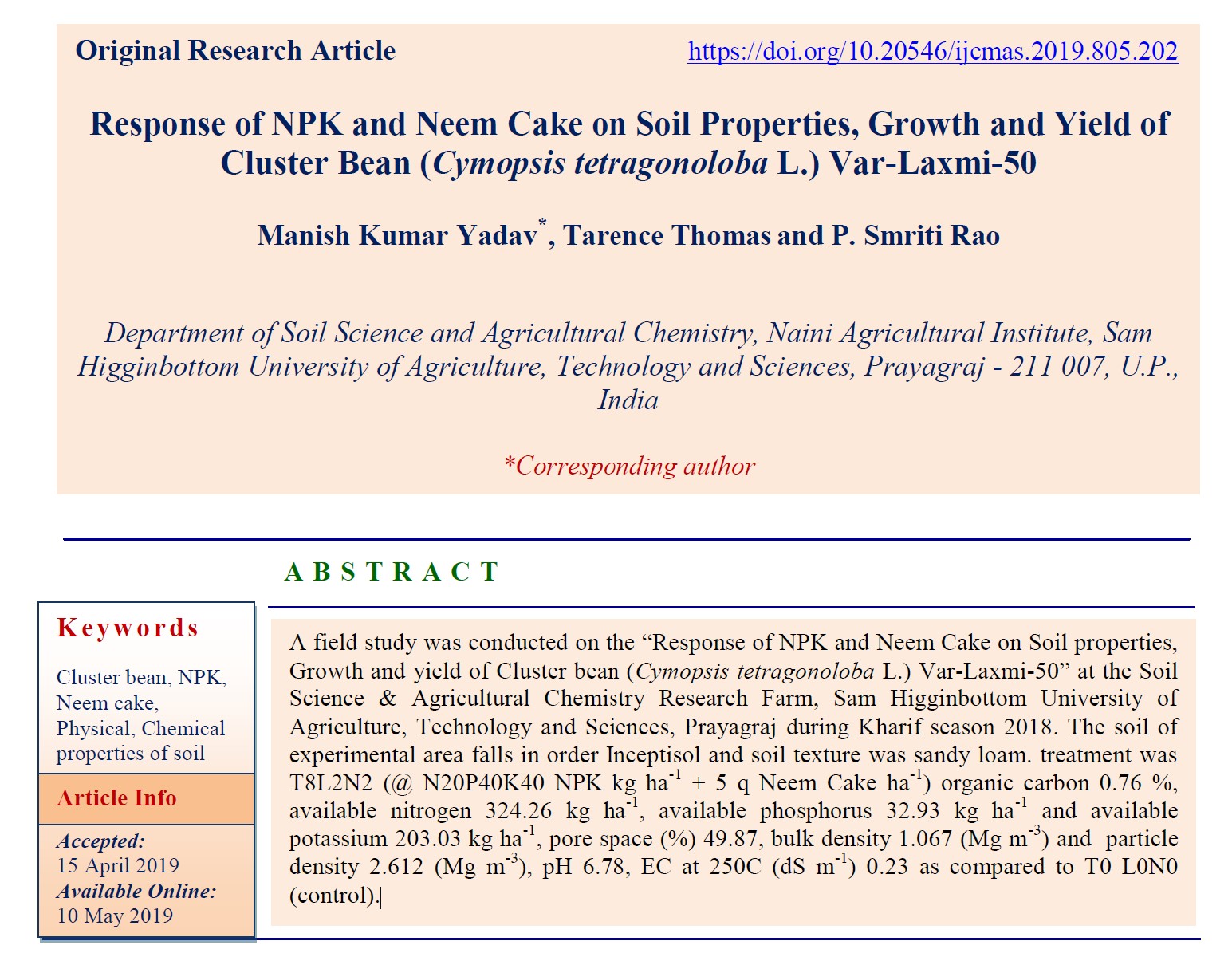 A field study was conducted on the “Response of NPK and Neem Cake on Soil properties,